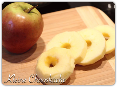 Jetzt die Äpfel schälen und das Kerngehäuse entfernen. Anschließend in etwa 8 mm dicke Scheiben schneiden.