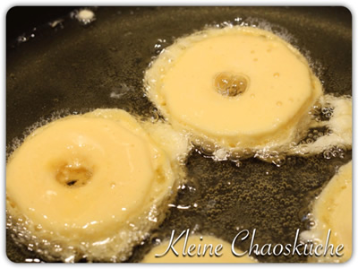 Je einen Ringen in den Teig geben, gut umhüllen und ab ins heiße Fett damit. Das Ausbacken dauert nur wenige Minuten. Nach 2 bis 3 Minuten die Ringe einmal wenden und nochmal 2 - 3 Minuten backen bis sie goldbraun sind.