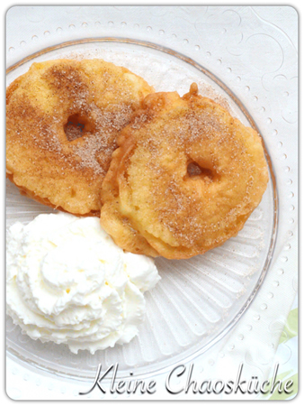 Die fertigen Apfelringe heraus nehmen, auf Küchenpapier abtropfen und dann noch warm mit Zimt/Zucker servieren.
