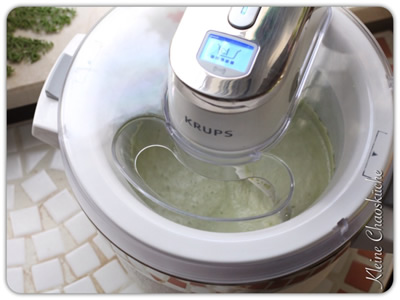Die Flüssigkeit dann in die laufende Eismaschine einlaufen lassen und dann einfach abwarten bis das Eis die gewünschte Konsistenz hat.