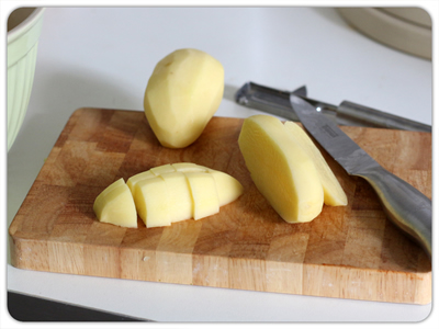 In der Zwischenzeit die Kartoffeln schälen und in ca. 1 cm groß Würfel schneiden.