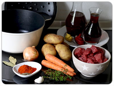 Eigentlich wollte ich ein orientalisches Gulasch machen mit Granatapfel und entsprechenden orientalischen Gewürzen. Da ich aber auf die Schnelle keinen Granatapfel und auch keinen Saft davon bekommen habe, wurde aus dem orientalischen Gulasch aus der Tajine eben ein Bier Gulasch Eintopf aus dem Schmortopf. Auch gut! Hauptsache lecker! Und bei nass-kaltem Wetter das perfekte Soulfood!