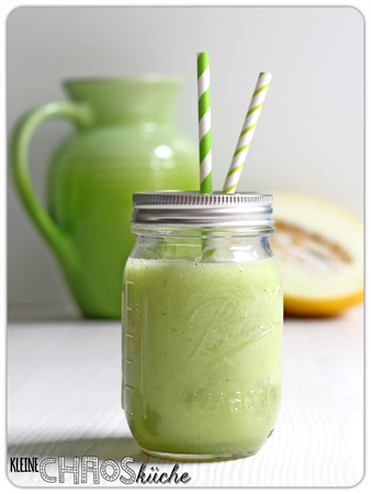 Und zum Schluß noch etwas Erfrischendes: ein Smoothie aus einer halben Honigmelone, einer halben Gurke, einer Limette und 5-7 großen Blättern Basilikum.