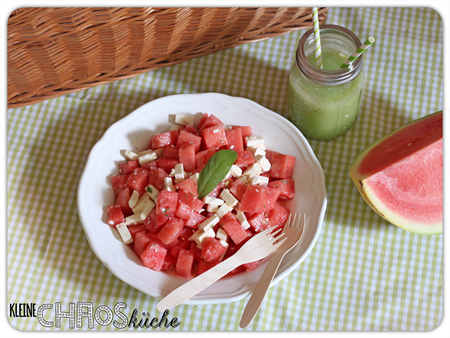 Aber auch pikant gewürzt schmeckt Wassermelone überraschend gut, so wie hier in diesem Melonen Feta Salat.