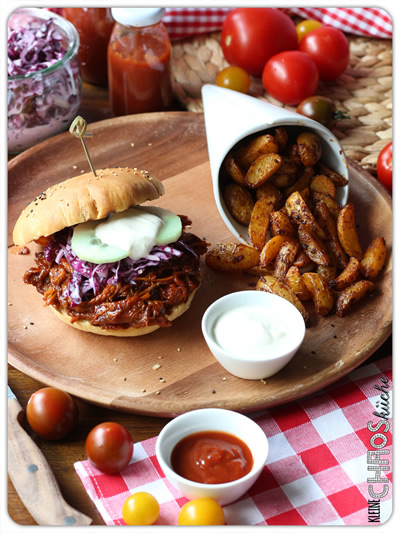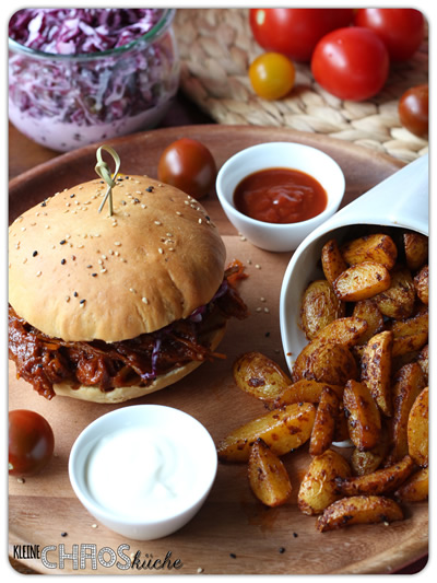 Je nach Größe der Burger Buns reicht das Pulled Pork nun für 3 - 4 Burger. Je nach Geschmack kann man die Burger dann noch mit Coleslaw, Gurkenscheiben, Tomaten, Käse und Salat belegen. Da sind dem eigenen Geschmack ja keine Grenzen gesetzt.