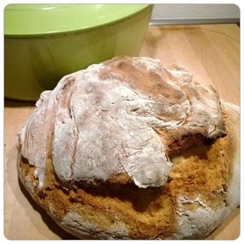 Aus dem Teig einen runden Fladen formen. Den heißen Topf aus dem Ofen nehmen, den Boden mit etwas Mehl bestäuben, den Teigfladen in den heißen Topf geben, den Deckel aufsetzen und ca. 55 Min. backen. Herausnehmen, aus dem Topf nehmen und auskühlen lassen.